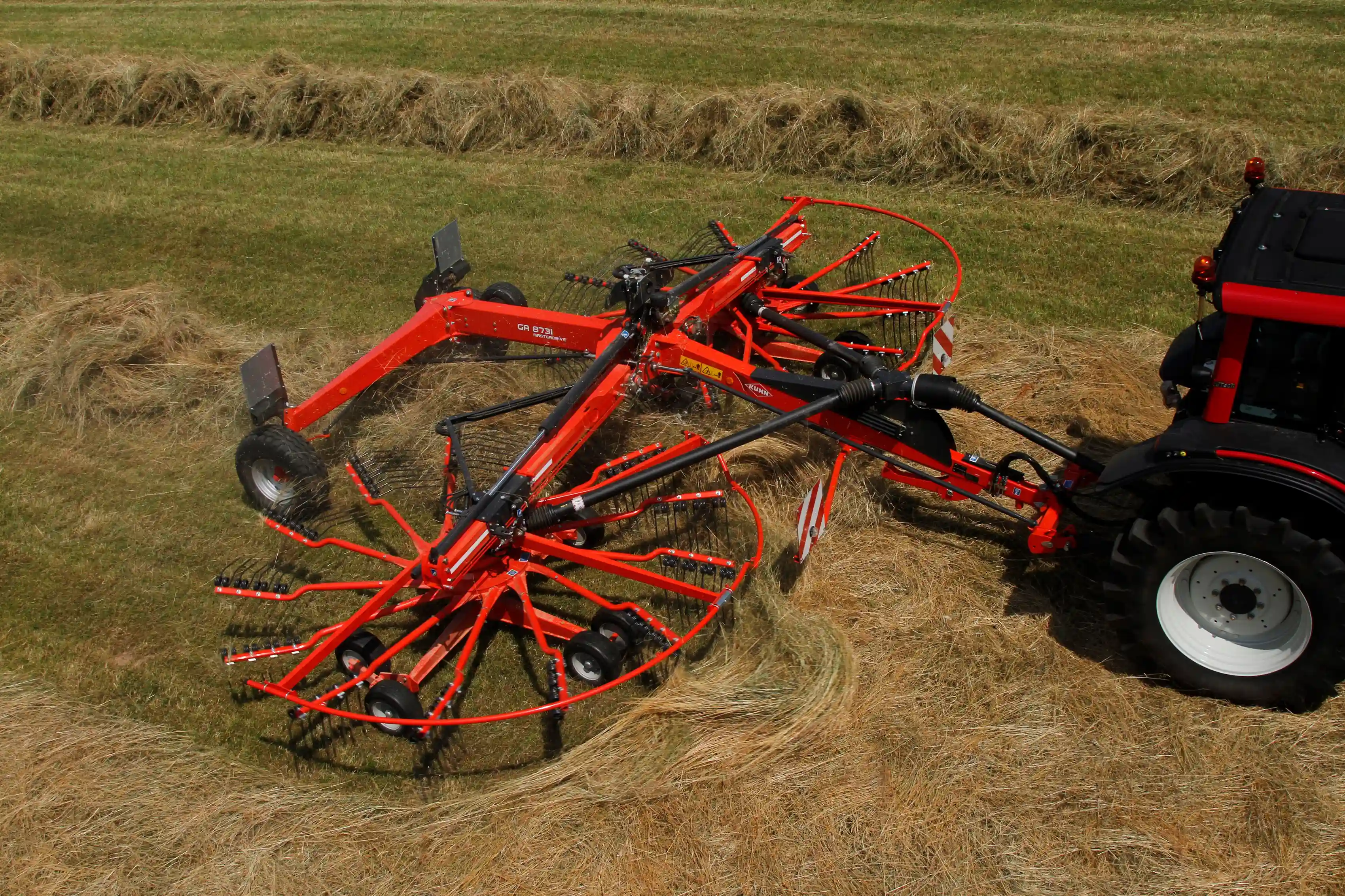 Daarnaast hebben we aan deze klant deze mooi complete Kuhn GA 8731 + hark verkocht. De hark heeft een werkbreedte van 8.70 mtr. en blijft bij transport onder de 4 mtr. transporthoogte. Voor een mooie bodemvolging beschikt de hark over een 3 D cardanisch tandemonderstel en tevens over het enkelzijdig uitheffen van de rotoren. Het sterke en bewezen punt van deze harken is nog altijd de Masterdrive G3 aandrijving van Kuhn.